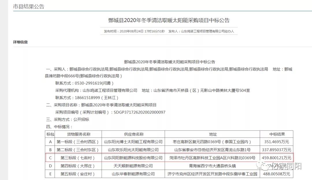 昨日,山東鳴諾工程項目管理有限公司發(fā)布了鄄城縣2020年冬季清潔取暖太陽能采購項目中標公告,其中,山東同陽新能源科技股份有限公司投中該項目的第三標段。